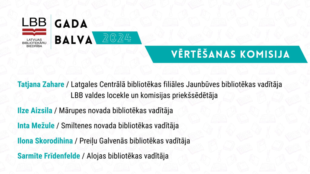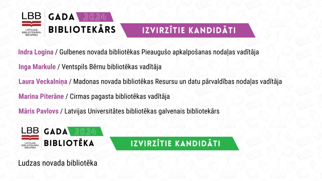 LBB konferences izskaņā 25. aprīlī Latvijas Nacionālās bibliotēkas (LNB) korē notika svinīgs pasākums, kurā godinājām 2024. gada novērtētākos kolēģus, pasniedzot LBB Gada balvas vairākās kategorijās. Gada balva tiek pasniegta jau 10. reizi nominācijā “LBB Gada bibliotēka” un 8. reizi nominācijās “LBB Gada bibliotekārs” un “Gada notikums Latvijas bibliotēkās”.